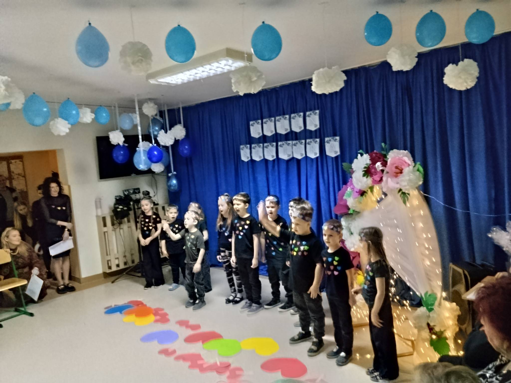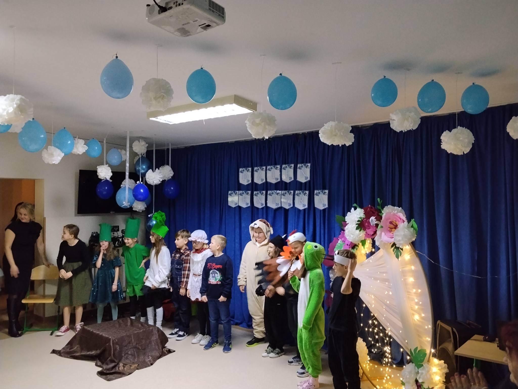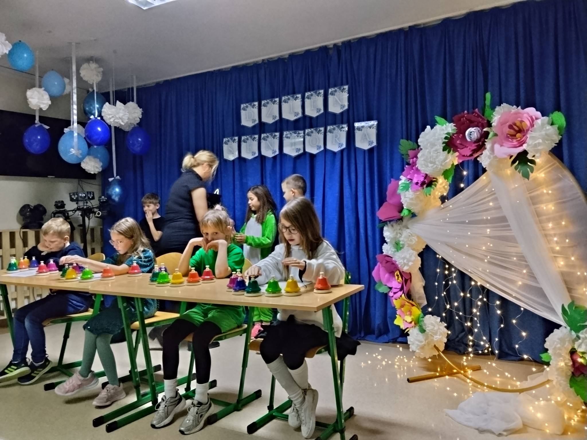 Uroczystość rozpoczęła się pięknym wykonaniem utworu „Sto lat” na dzwonkach w wykonaniu dzieci. Następnie wystąpiły dzieci z grupy „0” oraz najmłodsze przedszkolaki, które skradły serca publiczności. Kolejno na scenie zaprezentowały się klasy druga i trzecia z przedstawieniem „Rzepka” Juliana Tuwima oraz piosenkami i tańcami. Po ich występie usłyszeliśmy także Zosię Stasiak, która zagrała na keyboardzie „Sto lat”, wzruszając wszystkich obecnych.
