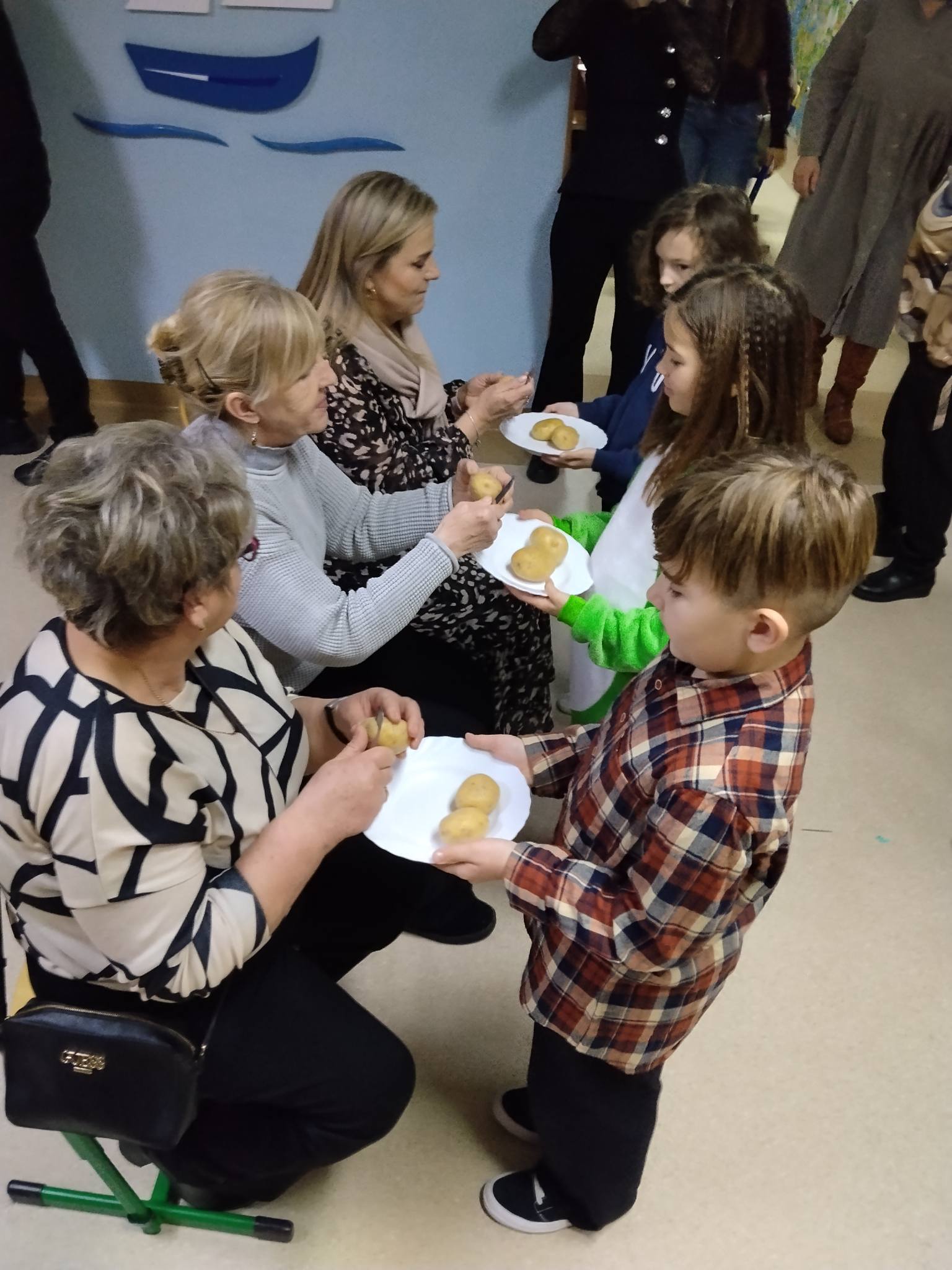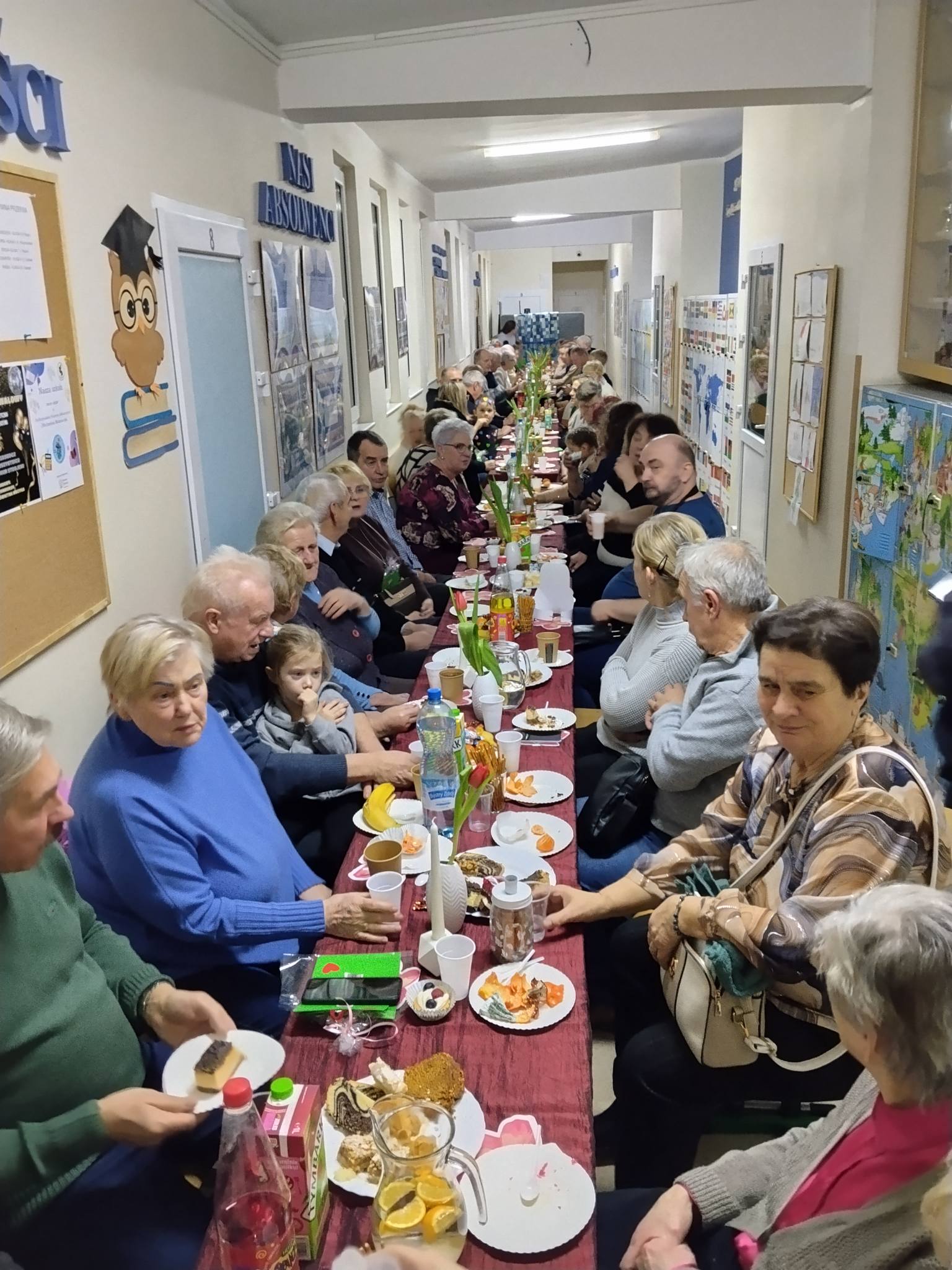 Po części artystycznej na seniorów czekał wspaniały poczęstunek – pyszne, domowe ciasta przygotowane przez rodziców, kawa i herbata. Był to czas na rozmowy, wspomnienia i wspólne bycie razem. Ogromnym zainteresowaniem cieszyły się również szkolne kroniki, dzięki którym wielu seniorów mogło powspominać swoje szkolne lata, bo – jak się okazało – wielu z nich uczęszczało kiedyś do naszej szkoły.
