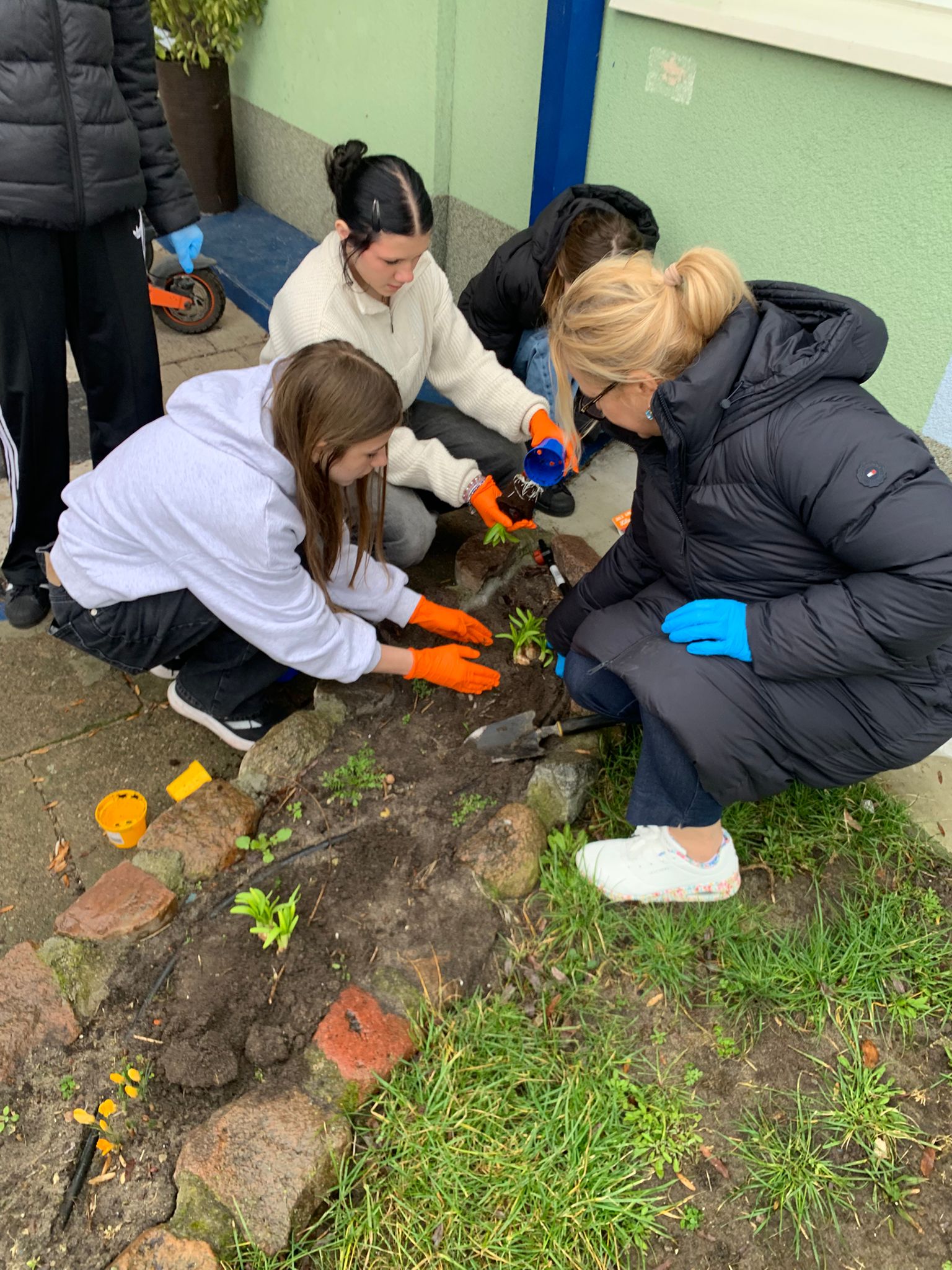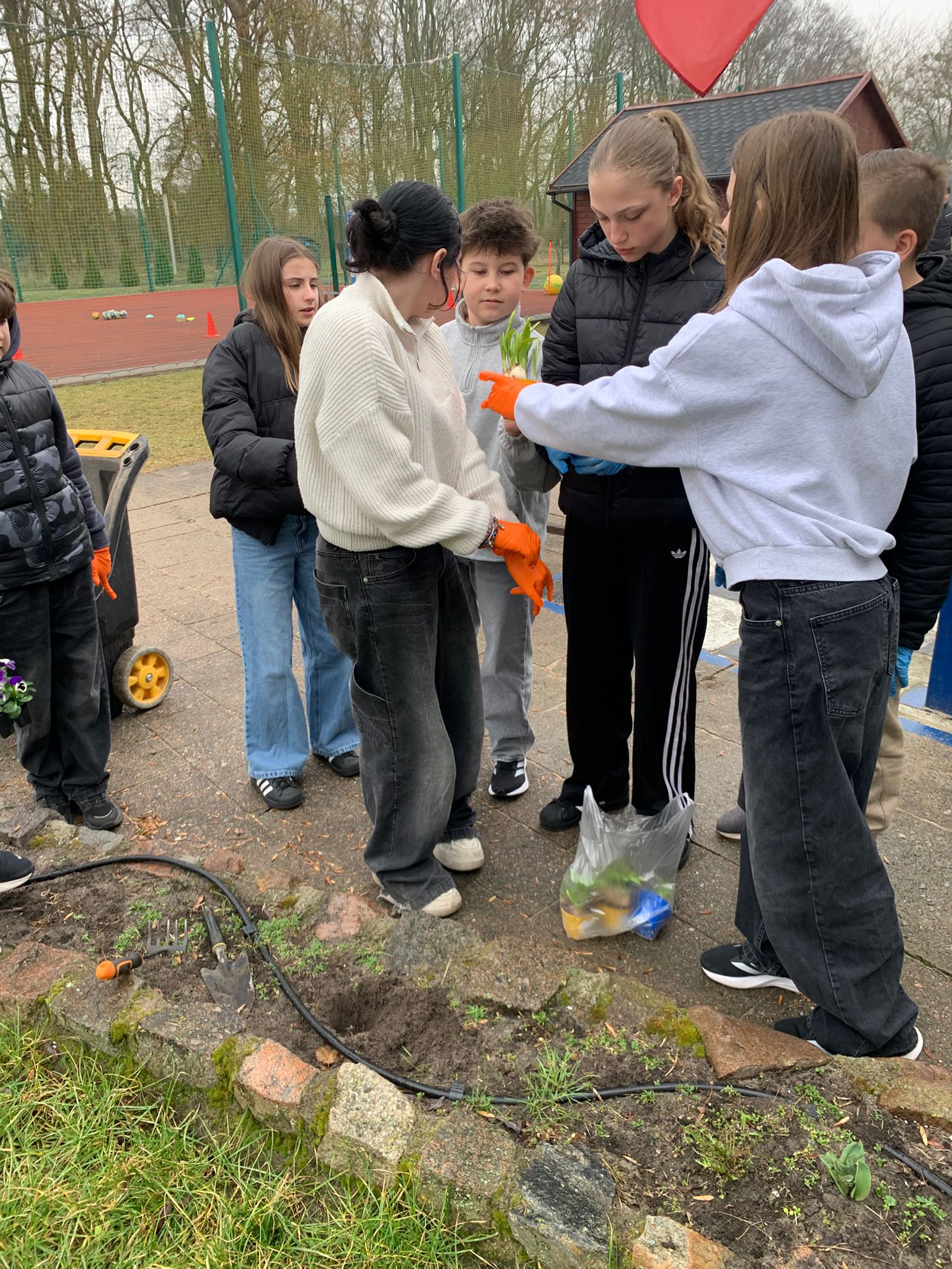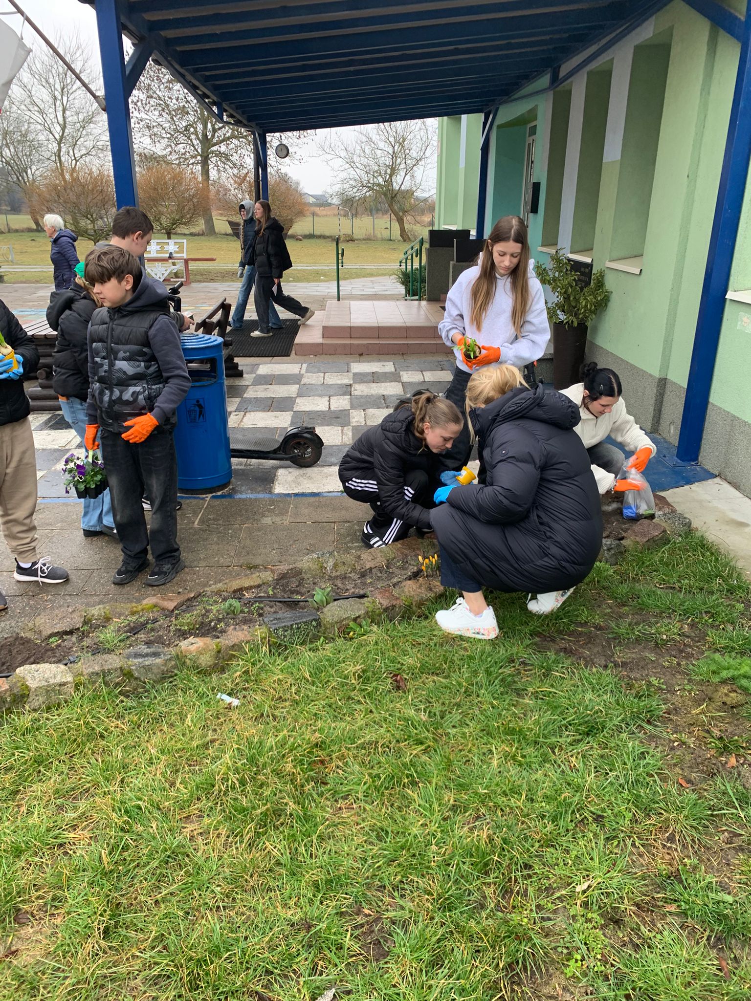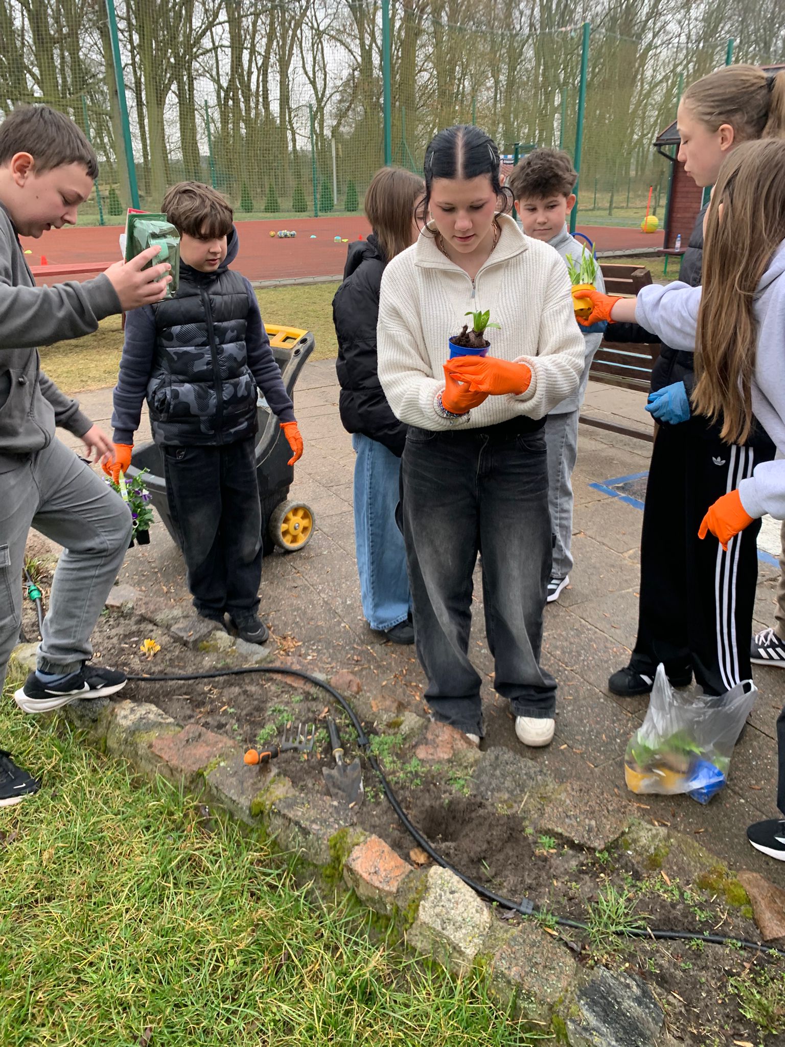 a podczas zajęć ekologicznych uczniowie sadzili cebulki kwiatów, ucząc się troski o przyrodę.