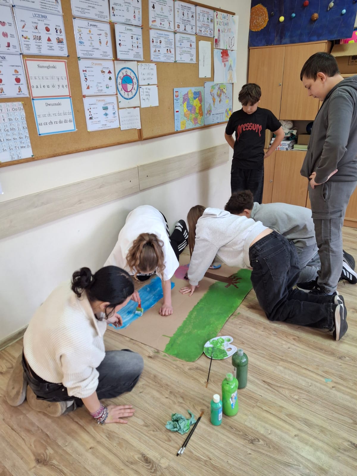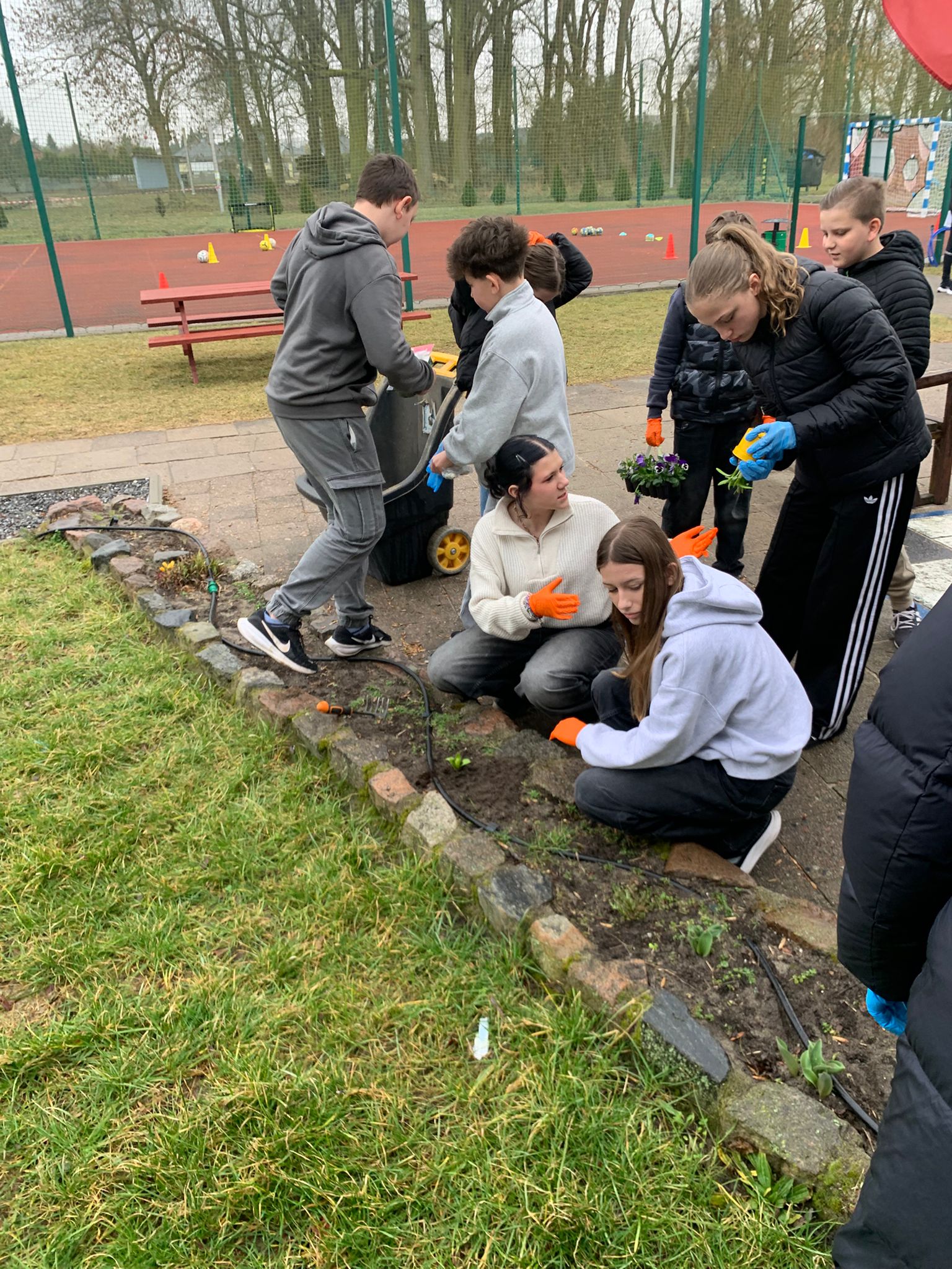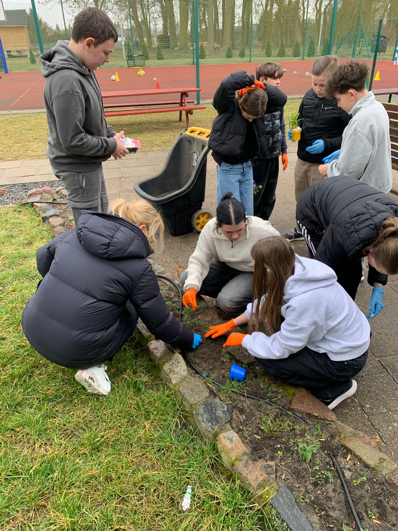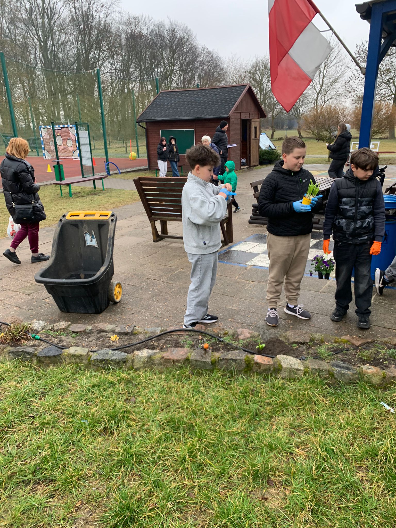 a podczas zajęć ekologicznych uczniowie sadzili cebulki kwiatów, ucząc się troski o przyrodę.